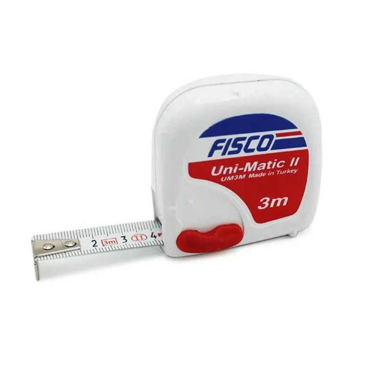 متر فوق یکی از محصولات تولیدی شرکت «فیسکو» است. این متر از نوع مترهای فلزی بوده و از قابلیت جمع شدن خودکار برخوردار است. و طول نوار آن 3 متر است. شرکت فیسکو این متر را با عرض 15 میلیمتر تولید میکند. اعداد روی این متر برحسب سانتیمتر روی یک سمت نوار درج شده است. از دیگر ویژگیهای این محصول میتوان به وجود قفل و گیره روی متر اشاره کرد. این قفل موجب نگه داشتن نوار فلزی شده و مانع از جمع شدن آن میشود. با کمک گیرهی متر نیز میتوانید آن را به کمربند خود متصل کنید و به همراه داشته باشید. در ابعاد 5 × 2.2 × 5 سانتیمتری تولید میشود.
