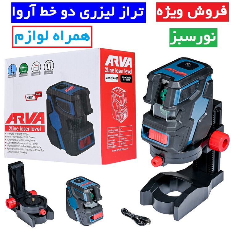 تراز لیزری دو خط (نور سبز) آروا مدل 4684 تراز لیزری دوخط نورسبز اروا مدل 4684 همراه لوازم کامل