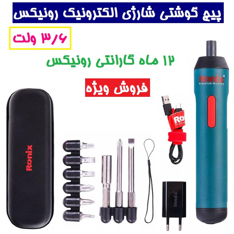 پیچ گوشتی شارژی الکترونیک 3.6 ولت رونیکس مدل 8591 همراه کیف و لوازم جانبی و کارت گارانتی شرکت رونیکس