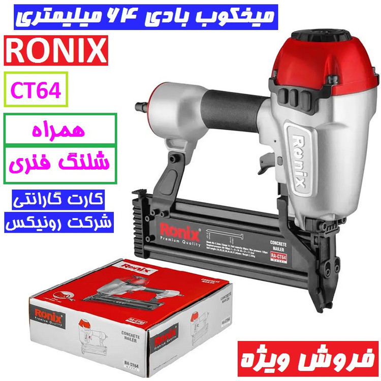 ویژگی ها دانلود نقشه انفجاری دانلود راهنمای کاربری - دارای اگزوز جهت خروج هوای اضافی - مجهز به روکش دسته نرم از جنس پلاستیک ضدتعریق و ضدلغزش جهت جلوگیری از خستگی کاربر - دارای سیستم ایمنی پیشرفته جهت حفظ ایمنی کاربر - قابل تنظیم روی دو حالت میخکاری به صورت تکبهتک یا رگباری - دارای محافظ لاستیکی از جنس رابر که از بدنه در برابر آسیبهای احتمالی محافظت میکند مشخصات کد محصول RA-CT64 وزن 2.93 کیلوگرم فشار کاری 60 ~ 100 psi (4-7 kgf/cm^2) حداکثر ظرفیت خشاب 80 میخ قطر گیج 14 ابعاد میخ 18, 25, 32, 38, 45, 50, 57, 64 میلی متر قطر شنک 2.2 میلی متر ابعاد دستگاه 330 * 310 * 115 میلی متر