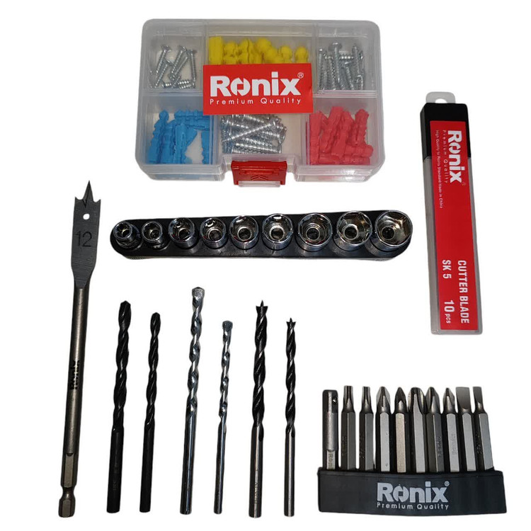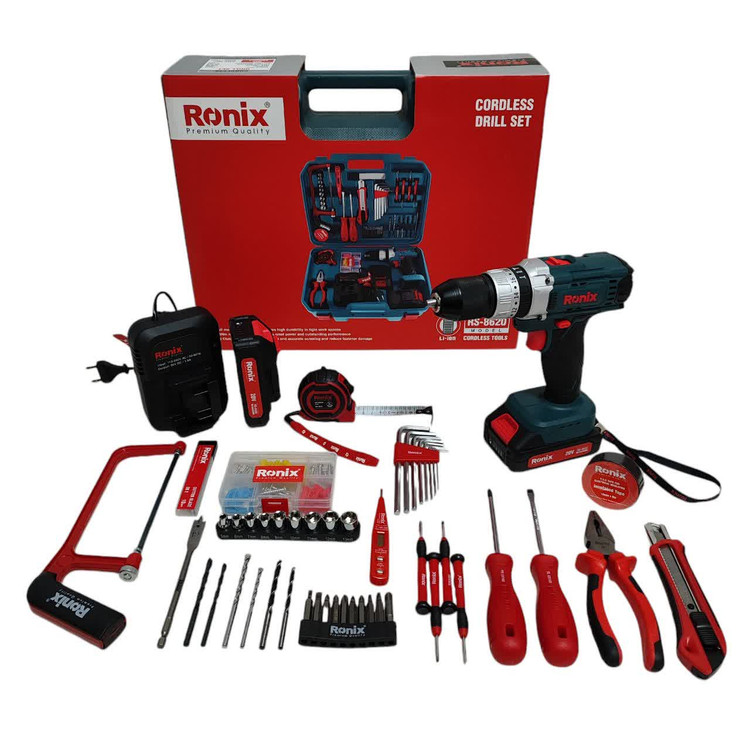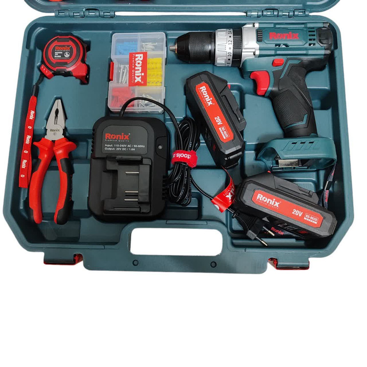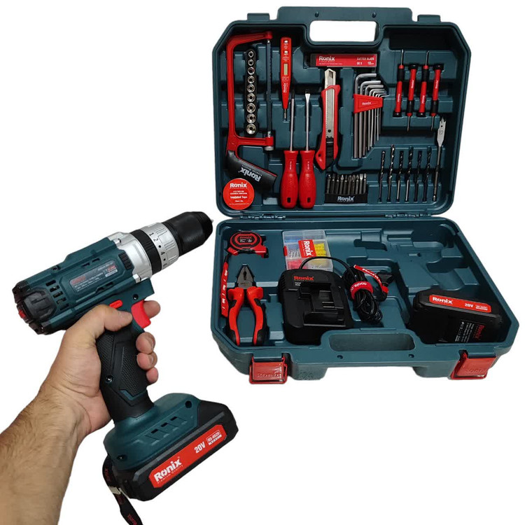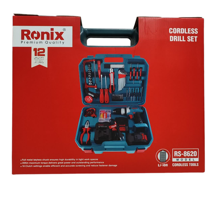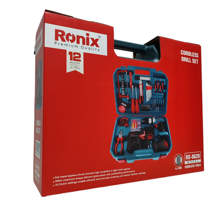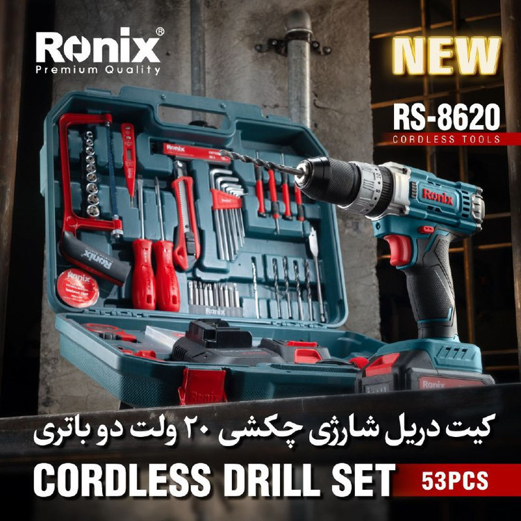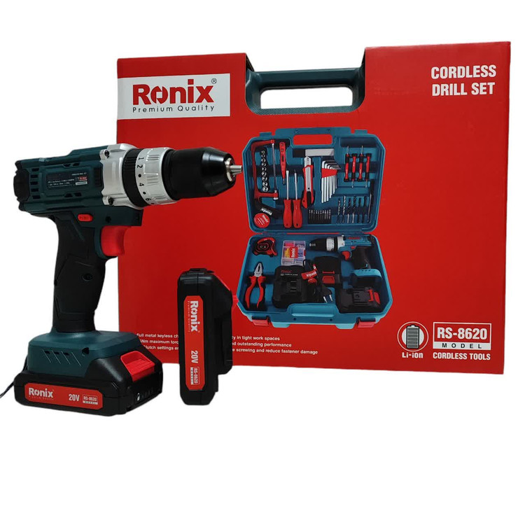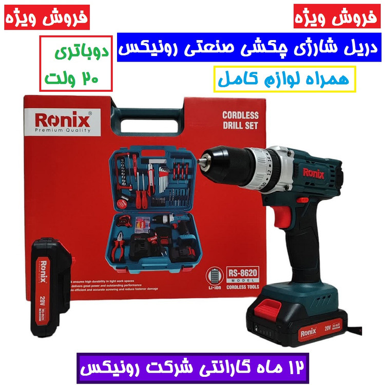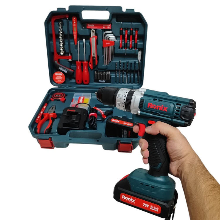 کیت دریل شارژی 20 ولت رونیکس RS-8620 همراه لوازم جانبی کامل و ساک BMC با گارانتی شرکت رونیکس دریل شارژی 8620 رونیکس