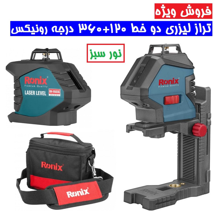 تراز لیزری دو خط 120+360 درجه نور سبز رونیکس مدل RH-9503G تراز لیزری نور سبز سه بعدی رونیکس مدل 9503g همراه لوازم کامل ۹۵۰۳g