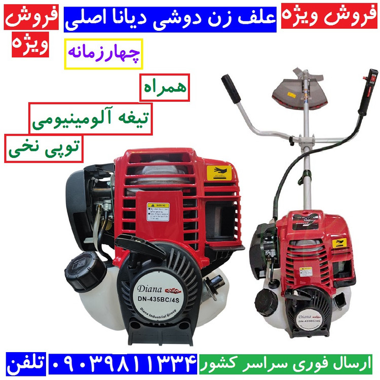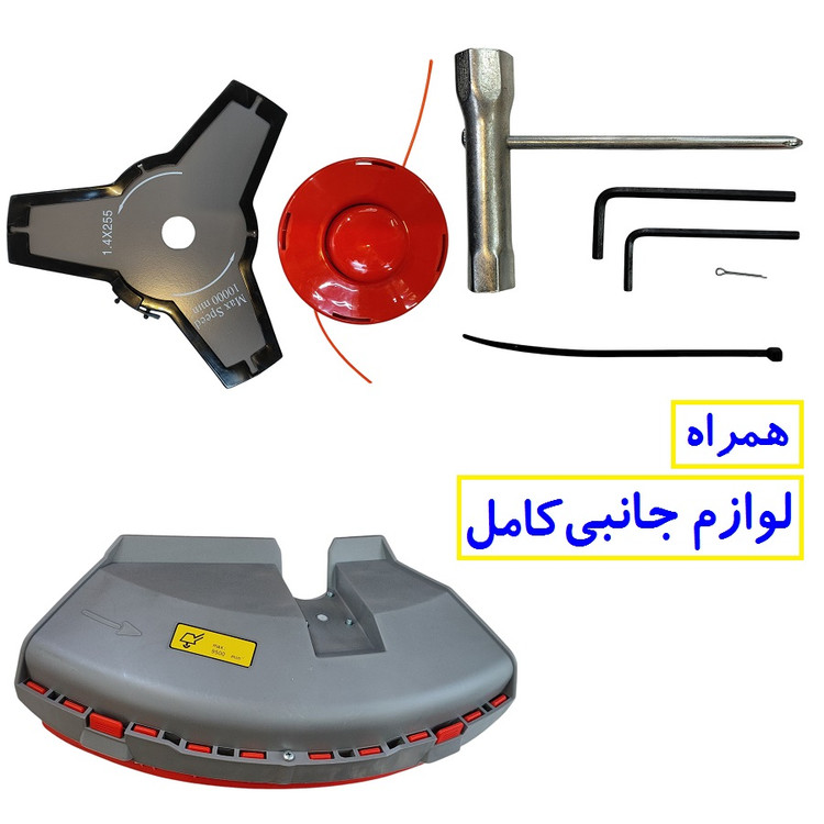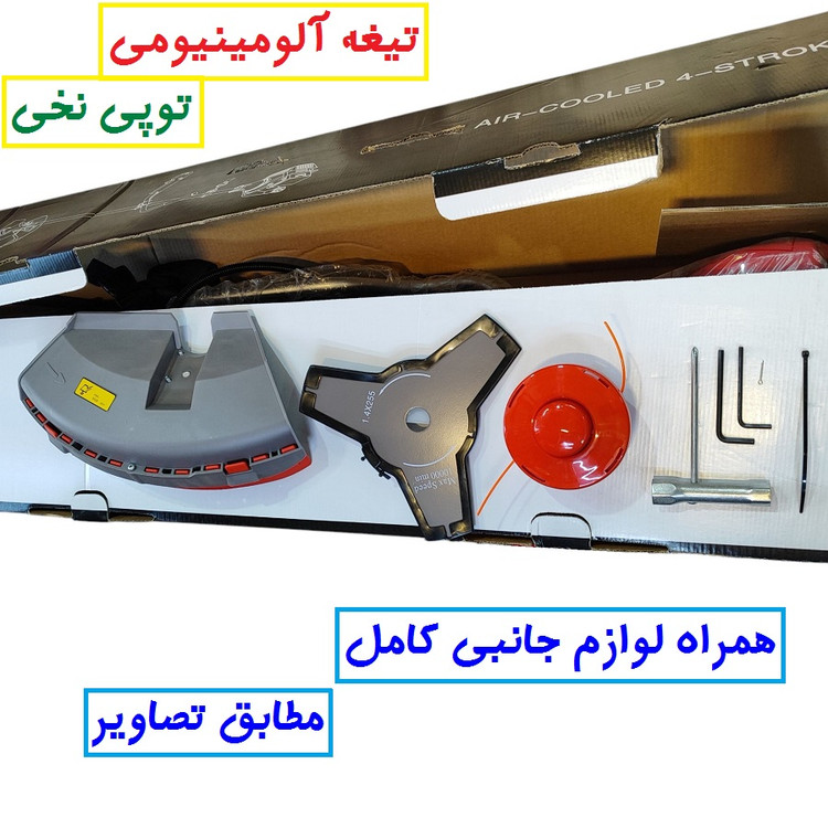 قدرت موتور 1.5 اسب بخار نوع موتور 4 زمانه, بنزینی نصب روی کاربر دوشی ظرفیت سیلندر 35 سی سی تیغههای همراه 3 پر توپی پلاستیکی چمنزن