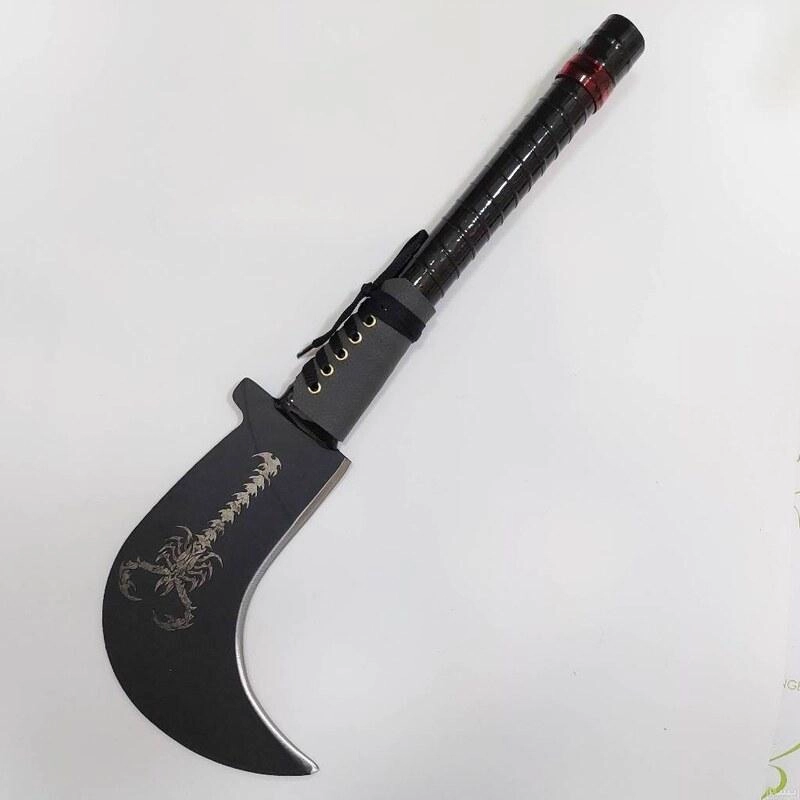 یک داس سفارشی وتکمیل باغلاف فوم دارای طرح عقرب روی تیغه که بالیزر کار شده،همچنین مهر زنجان روی تیغه هر دوطرف کار بسیار تیز وبرنده آلیاژ فولادفنر رنگ کوره ای(ضدزنگ شده) جنس دسته لوله فولادی نوارپیچ شده طول کلی 50 سانتیمتر دسته30 سانتیمتر تیغه طول 19 سانتیمتر در عرض 17 سانتیمتر با کیفیت،تیز و برنده برای هیزم شکن مناسب کمپینگ،کوهنوردی و طبیعتگردی