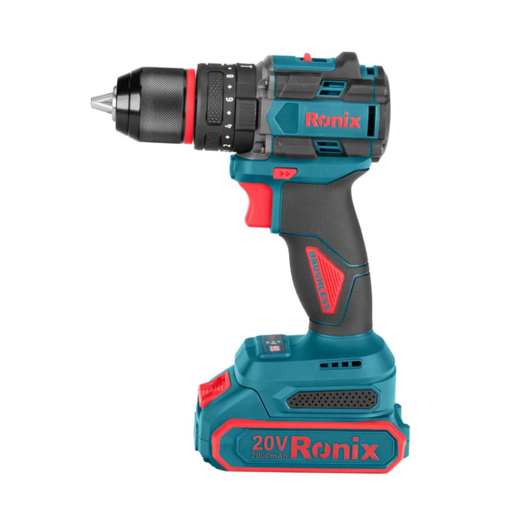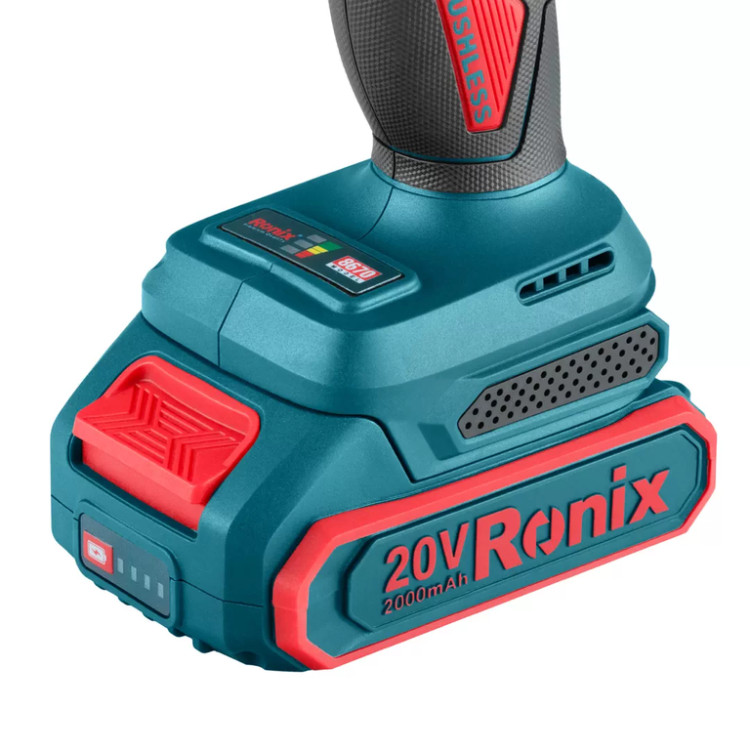 دریل شارژی چکشی براش لس 20 ولت دو باتری 13 میلی متری 60 نیوتن متر رونیکس مدل 8670 همراه کیف حمل با گارانتی شرکت رونیکس