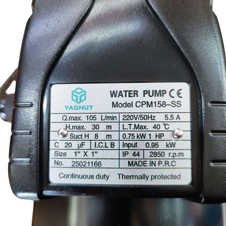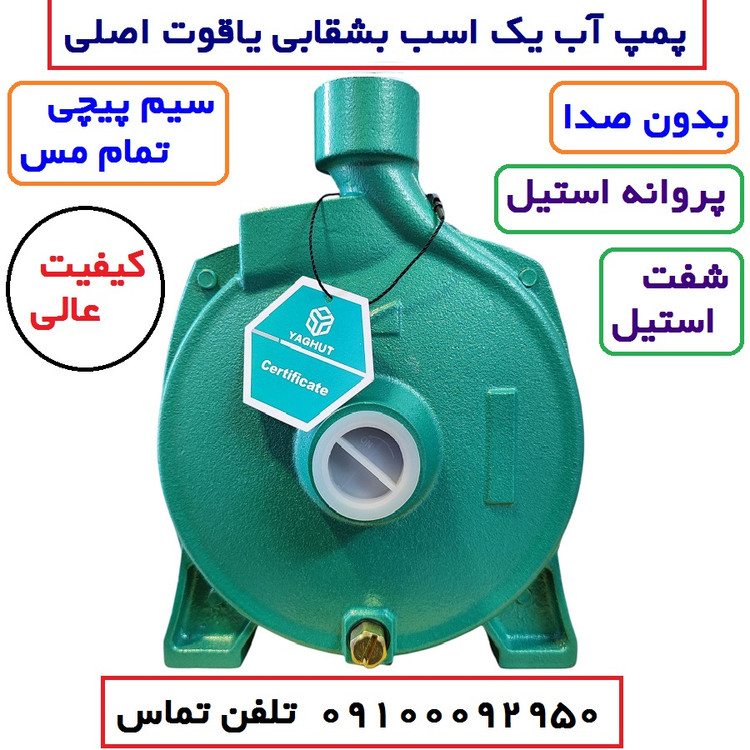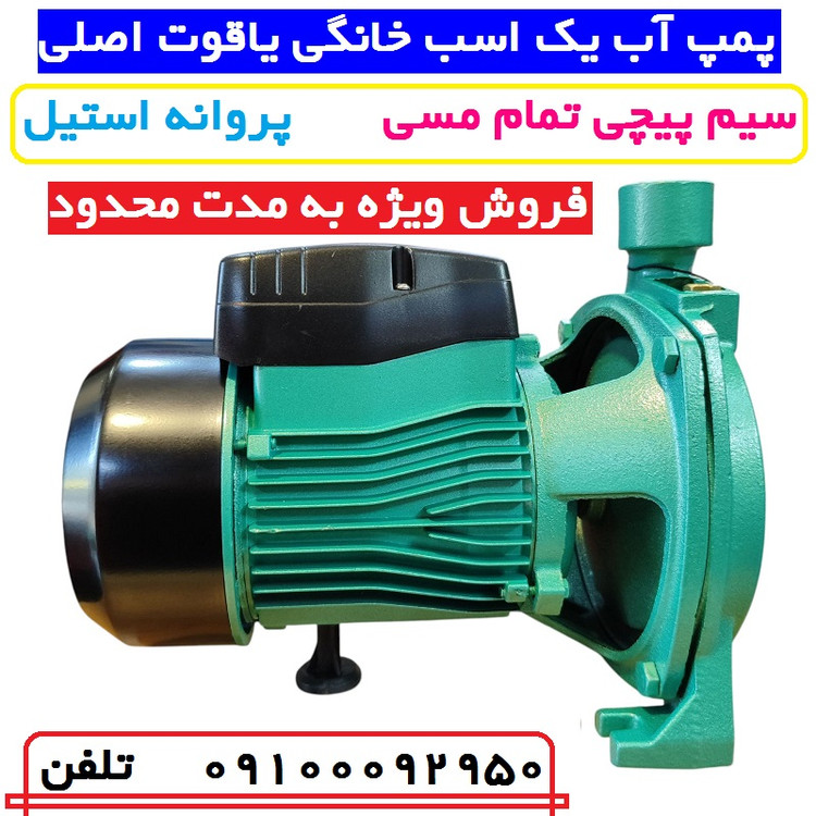 پمپ اب یک اسب بشقابی یاقوت ساخت کشور چین ( درجه یک ) سیم پیچ مسی شفت استیل پروانه استیل بلبرینگ های دور بالا فوق العاده بی صدا حداکثر ارتفاع 32 متر فوق العاده قوی حداکثر دبی 110 لیتر در دقیقه یکی از قوی ترین پمپ های وارداتی ورودی و خروجی 1 اینچ خازن 20 آمپر 5/5 کلاس عایق بندی B حداکثر تحمل گرما اب 40 درجه سانتیگراد 2850 دور Ip44 در برابر نفوذ اf عالی برای 1 الی 4 طبقه عالی برای منازل ویلایی