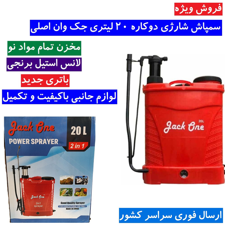 سمپاش شارژی 20 لیتری جک وان اصلی سم پاش شارژی دو کاره جک وان همراه لانس برنجی باتری جدید همراه لوازم جانبی