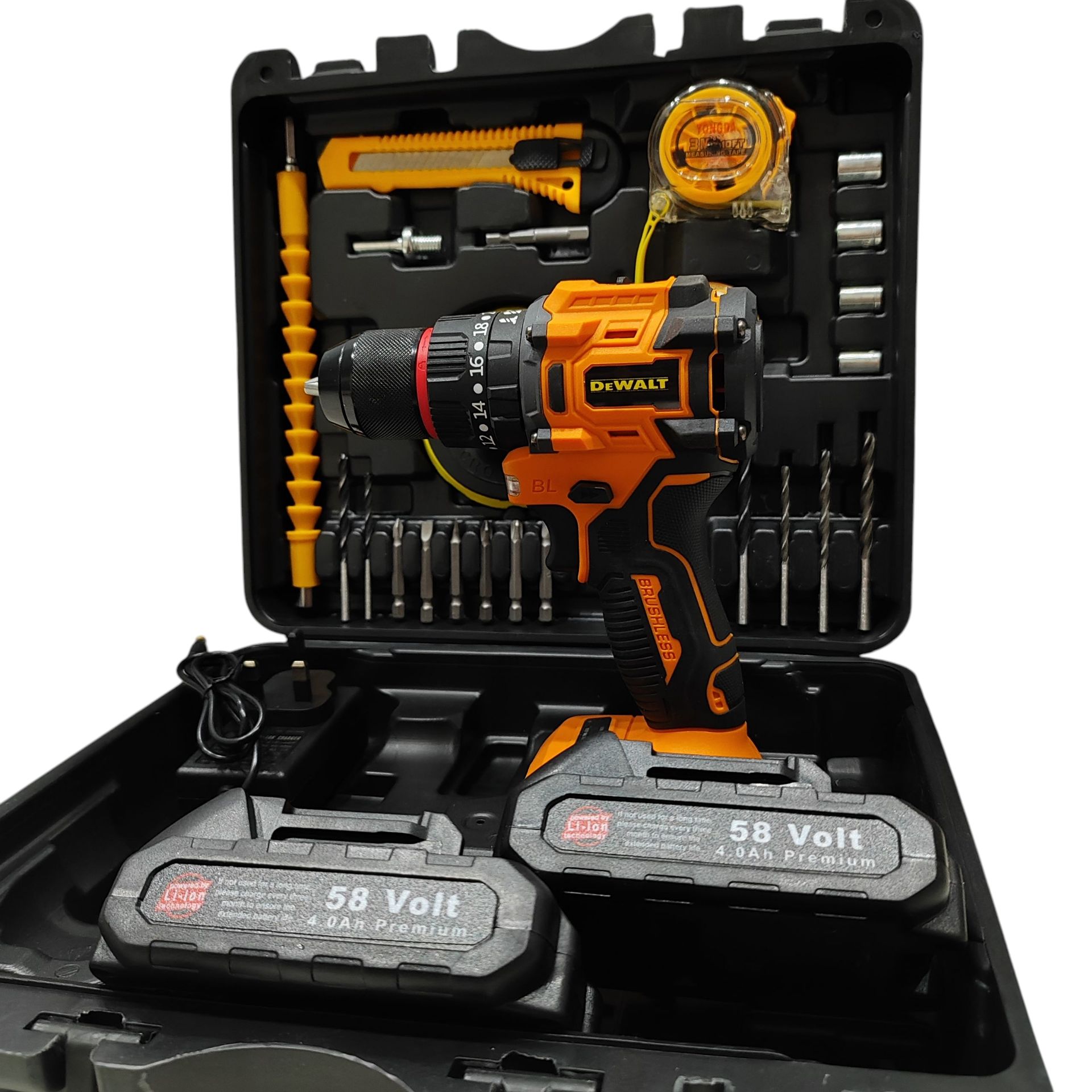 مشخصات کلی ابعاد ۱۶x۷x۲۴ سانتیمتر وزن ۳ کیلوگرم مشخصات فنی و عملکردی ولتاژ 58 ولت منبع تغذیه باتری قابل شارژ سرعت حرکت آزاد ۰ الی ۱۵۰۰ دور بر دقیقه RPM سایر مشخصات ویژگیهای دریل سیستم گردش چپگرد سیستم گردش راستگرد قابلیت کنترل سرعت
