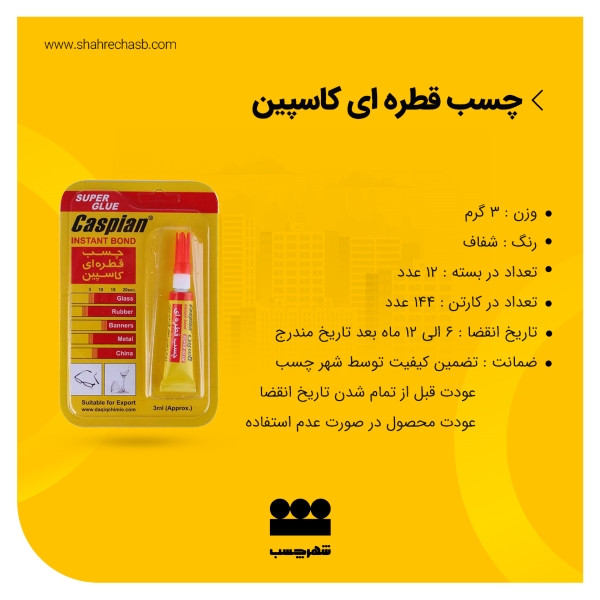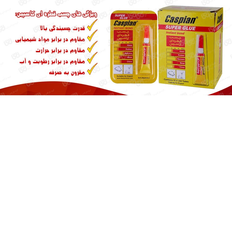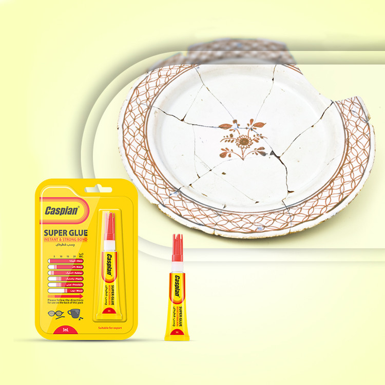اگر از كاربردهاي چسب قطره اي كاسپين مطلع باشيد، ميدونيد كه گزينه مناسبي براي چسباندن سراميك، چيني و سفال هست. پس به جاي اينكه ظروف شكسته رو دور بريزيد، خودتون دست به کار بشيد و با چند قطره همه چيز رو مثل روز اول درست كنيد. نحوه استفاده : به منظور بهترین کاربری از خشک و تمیز بودن سطح اطمینان حاصل کنید و همچنین در منطقه ای با تهویه مناسب استفاده شود. یک لایه ی نازک ازچسب قطره ای را در محل مورد نظر قرار دهید هر چه لایه چسب نازکتر باشد، چسبندگی قوی تر و سریع تر خواهد بود. قطعات چسبانده شده را بلافاصله به هم فشار دهید و برای مدت کوتاهی (5-20 ثانیه برحسب نوع سطوح) نگه دارید. پس از استفاده، محل سر تیوب را تمیز کرده و به منظور عمر طولانی تر چسب آن را در جای خنک و خشک و به صورت عمودی (جهت جلوگیری از گرفتگی نازل) نگه دارید. ویژگی: چسب قطره ای در برابر الکل ها، بنزین، روغن و اکثر حلال ها مقاوم بوده و همچنین در برابر رطوبت و حرارت نیز مقاومت خوبی دارد. برای چسباندن دو سطح توسط چسب قطره ای لازم است مقدار بسیار کمی از آن به کار برید (برای هر 6 سانتی متر مربع یک قطره باید به کار رود) کاربرد: چسب قطره ای به دلیل برخورداری از رقت، برای اجسامی که به نفوذ چسب نیاز دارند بسیار مناسب است چسب قطره ای را میتوان برای چسباندن قطعات فلزی، چرمی، سرامیک، اکثر پلاستیکها، چوب، جواهرات، ناخن دست، لاستیک، سفال استفاده کرد قابل استفاده در سطوح صاف برای چسباندن قطعات شیشه ای، لباس چرمی، تفلون و سطوحی که در معرض مداوم آب هستند توصیه نمی شود موارد ایمنی : چسب قطره ای چسبی سمی می باشد و هنگام کار با آن باید از دستکش، عینک و ماسک استفاده شود و بخار آن نیز نباید تنفس شود و در هنگام تماس با چشم و پوست باید سریعاً به پزشک مراجعه نمود. حلال چسب قطره ای خشک شده استون می باشد و باید به تدریج توسط پنبه آغشته به استون تمیز شود.