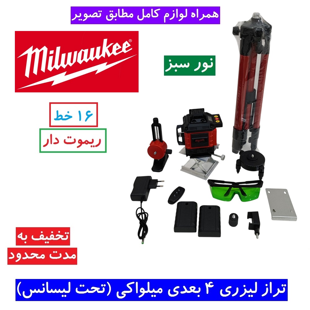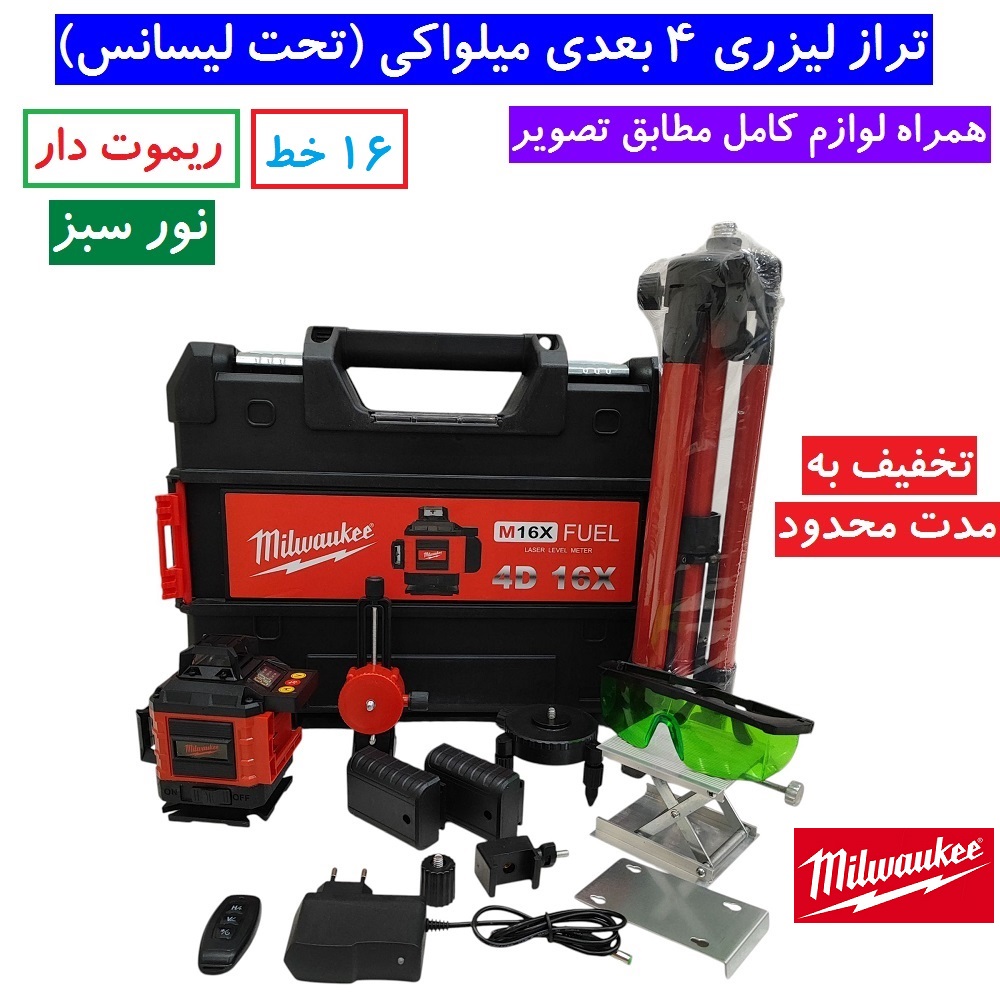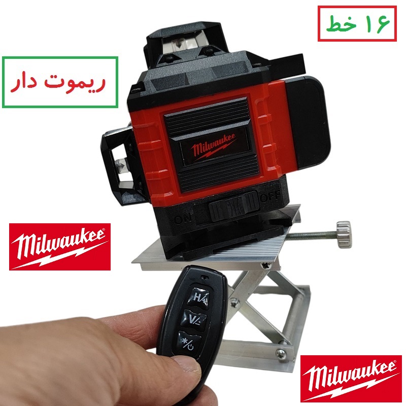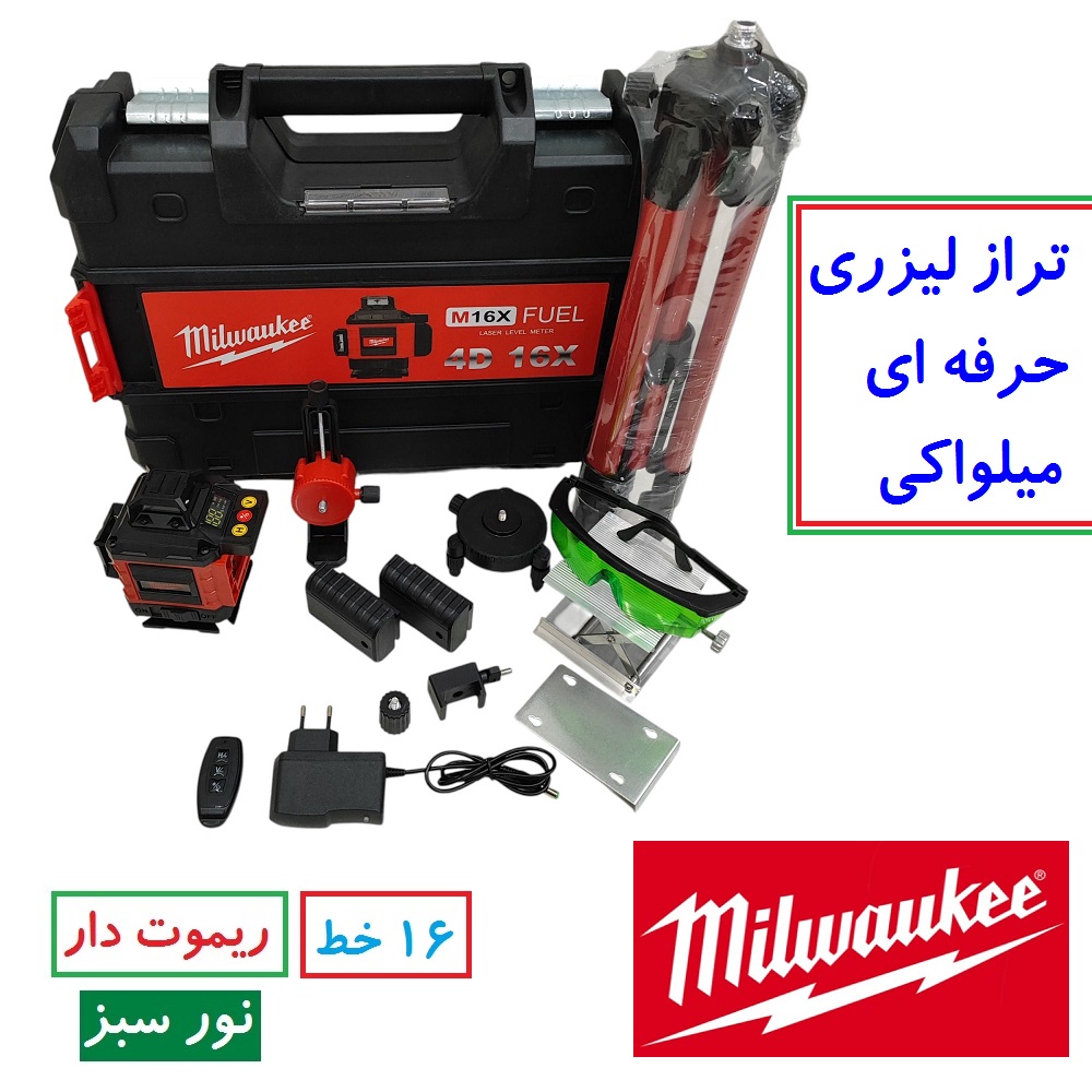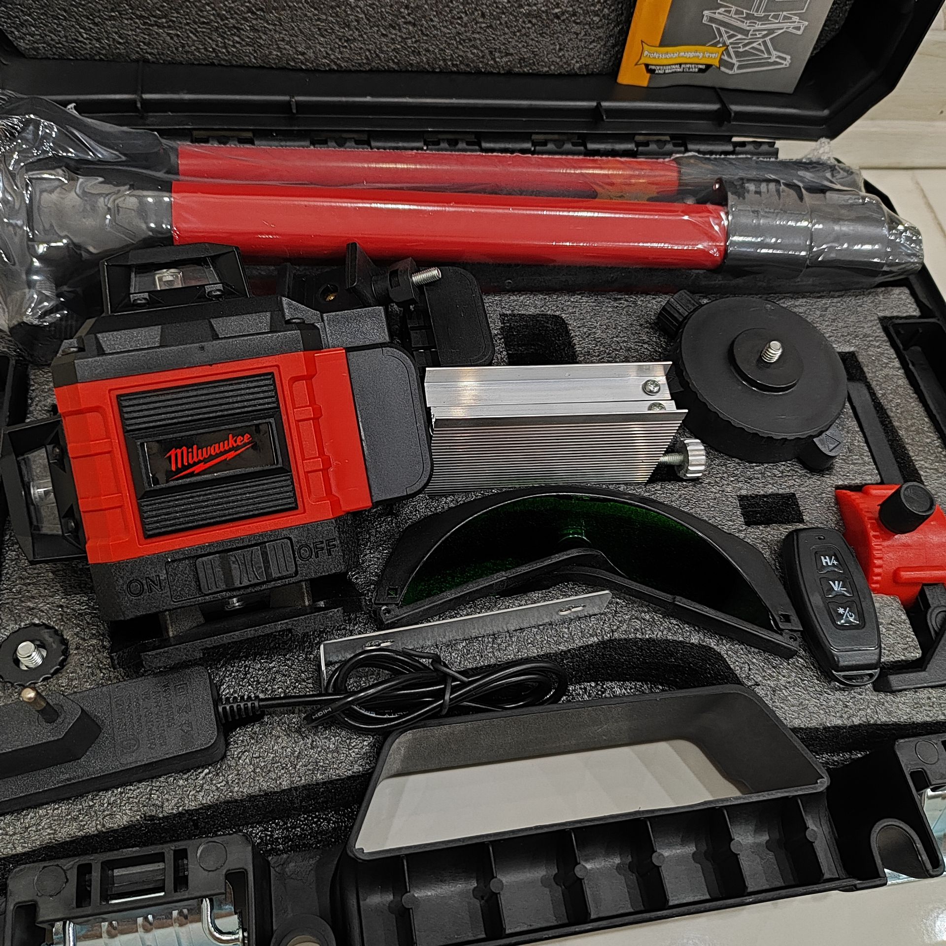 تراز لیزری حرفه ای نور سبز ریموت دار میلواکی 16 خط 4 بعدی 360 درجه همراه سه پایه و لوازم کامل