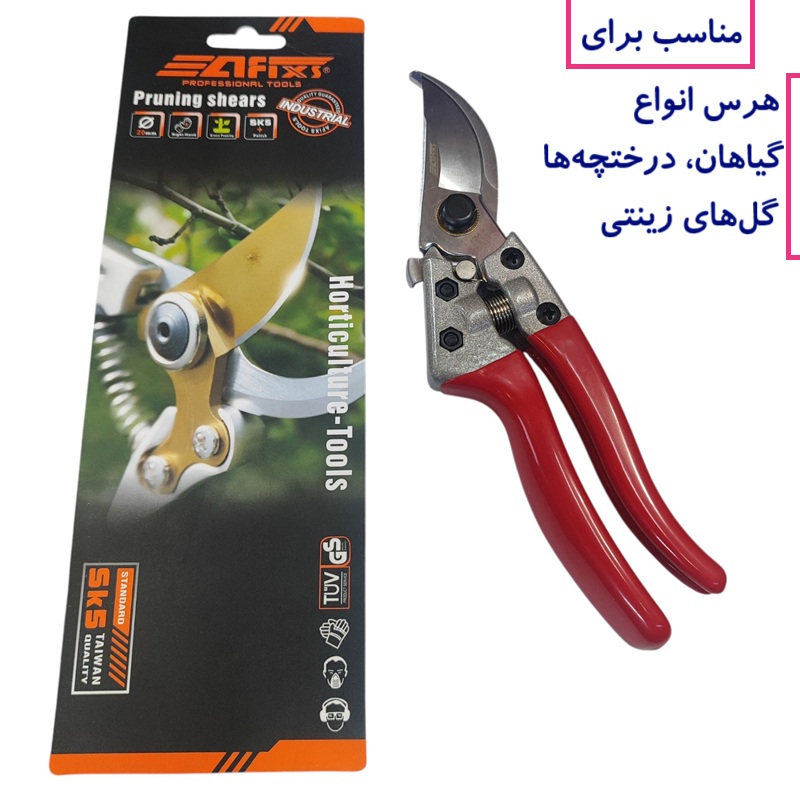 قیچی باغبانی آفیکس Afixs طرح فیسکارس تیغه فولادی سخت کاری شده دسته ضد لغزش دارای قفل ایمنی قیچی هرس باغ