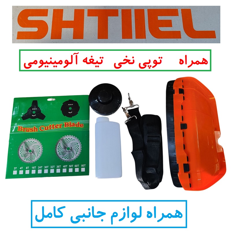 علف زن (علفتراش) دوشی ۲ زمانه طرح اشتیل 52CC پیستون بزرگ با توپی نخی و تیغه آلومینیوم همراه لوازم جانبی کامل