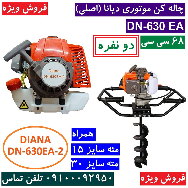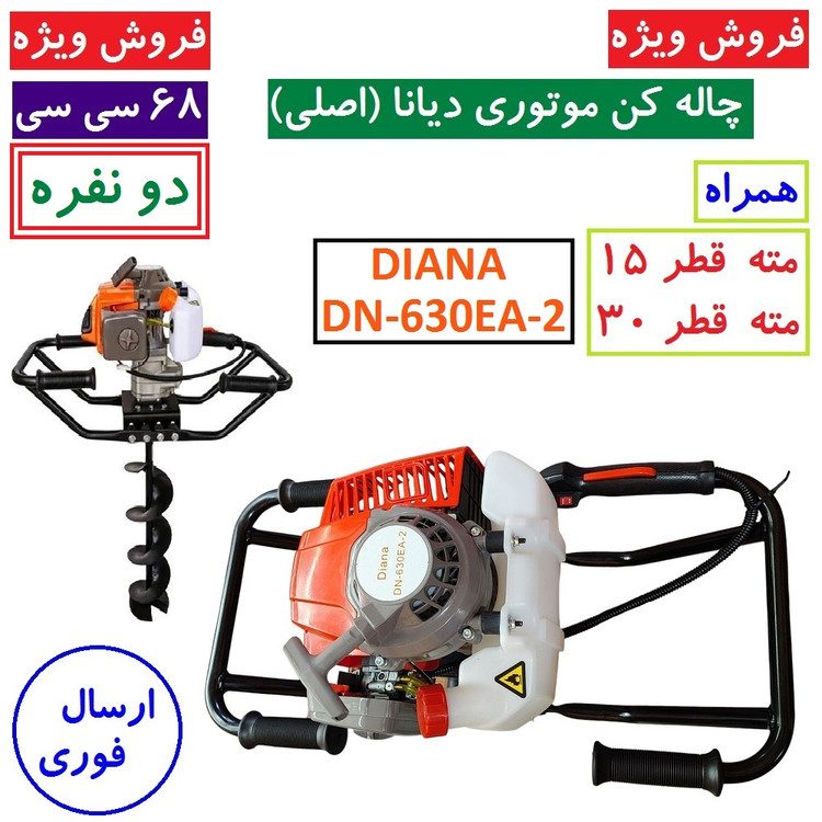 عنوان: Diana DN-630EA | چاله کن موتوری 3 اسب بخار حرفه ای... موتور: 1E48FA قدرت و عملکرد: 3 اسب بخار | دو زمانه | بنزینی * **افزایش سرعت حفاری:** چاله کن دیانا دو نفره 68 سی سی با موتور قدرتمند، سرعت حفاری را به طور قابل توجهی افزایش می دهد. * **کاهش نیروی کارگر:** این چاله کن با وجود دو نفر ، نیاز به نیروی کارگر بیشتری را کاهش می دهد. * **افزایش عملکرد و راندمان:** با استفاده از چاله کن دیانا دو نفره 68 سی سی ، می توان در زمان و نیروی کار صرفه جویی کرد و عملکرد و راندمان را افزایش داد. * **کاهش هزینه ها:** با افزایش سرعت و راندمان کار ، در هزینه های نیروی کار و زمان صرفه جویی می شود. چاله کن دو نفره دیانا DN-630EA-2 : یکی از ادوات پرکاربرد و پر مصرف باغداران دستگاه چاله کن می باشد که با توجه به حجم باغ و نوع کاربری متفاوت می باشد . از این رو Diana به عنوان یکی از معتبر ترین برندهای تولید ماشین آلات و ادوات کشاورزی ،این محصول خود را روانه بازار نموده است . این چاله کن با قدرت موتوری 3 اسب بخار و انجین 1E48F با عملکرد دو زمانه توانسته است نیاز کاربران را بر طرف نماید . گیربکس از نوع روغنی و گریس خور بوده و شاسی این دستگاه بصورت دوبل طراحی گردیده است تا نگهداری دستگاه با این توان برای اپراتور سخت نبوده باشد . این دستگاه چاله کن معمولاً با دو مته حرفه ای ارائه می گردد تا جهت مصارفی چون نهال کاری ، چالکود دهی درختان ، حفر گودال آب ،هواددهی خاک ، نصب تیر ، پایه فنس و سایر موارد ؛ قابل استفاده باشد.جهت کسب اطلاعات بیشتر با واحد فروش تماس حاصل فرمائید.