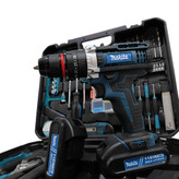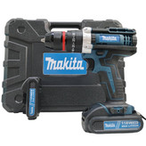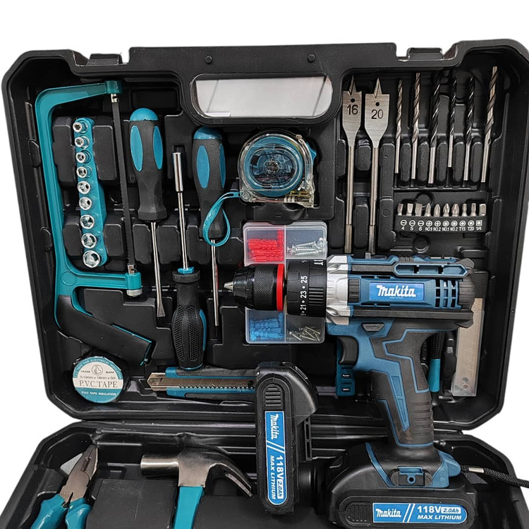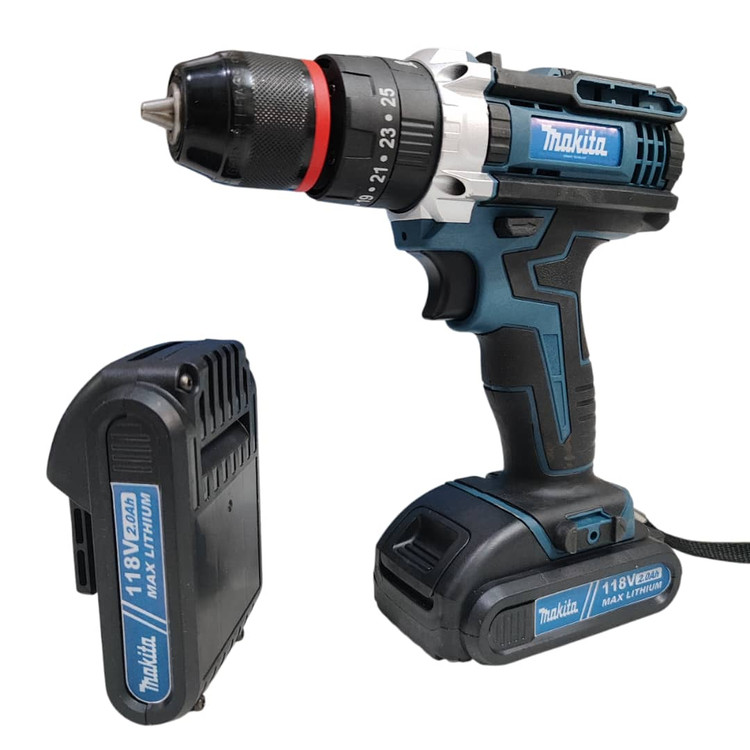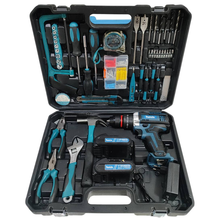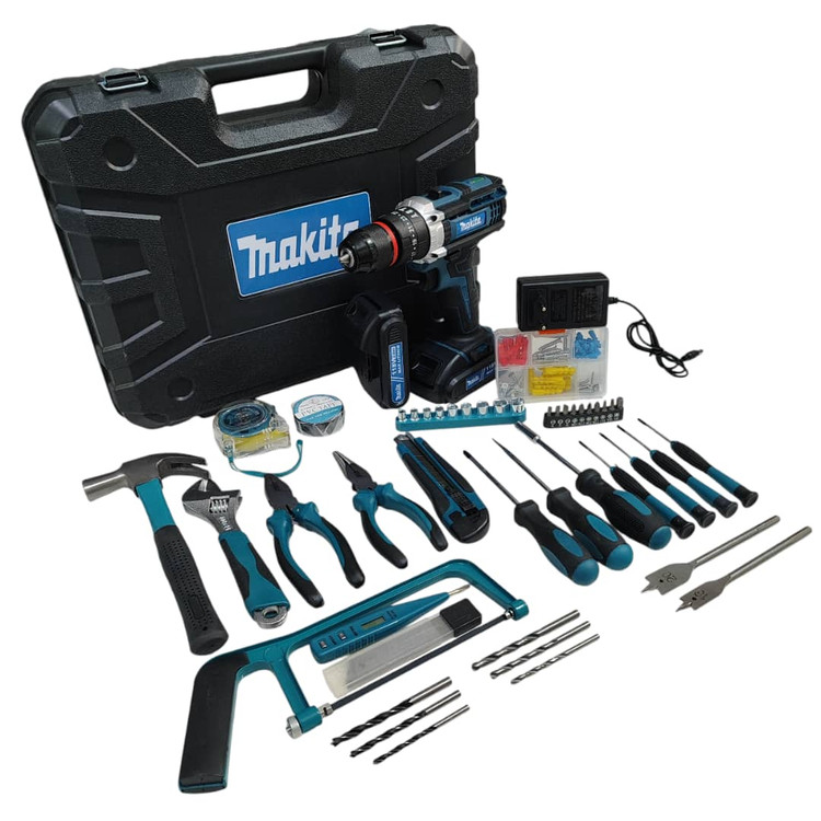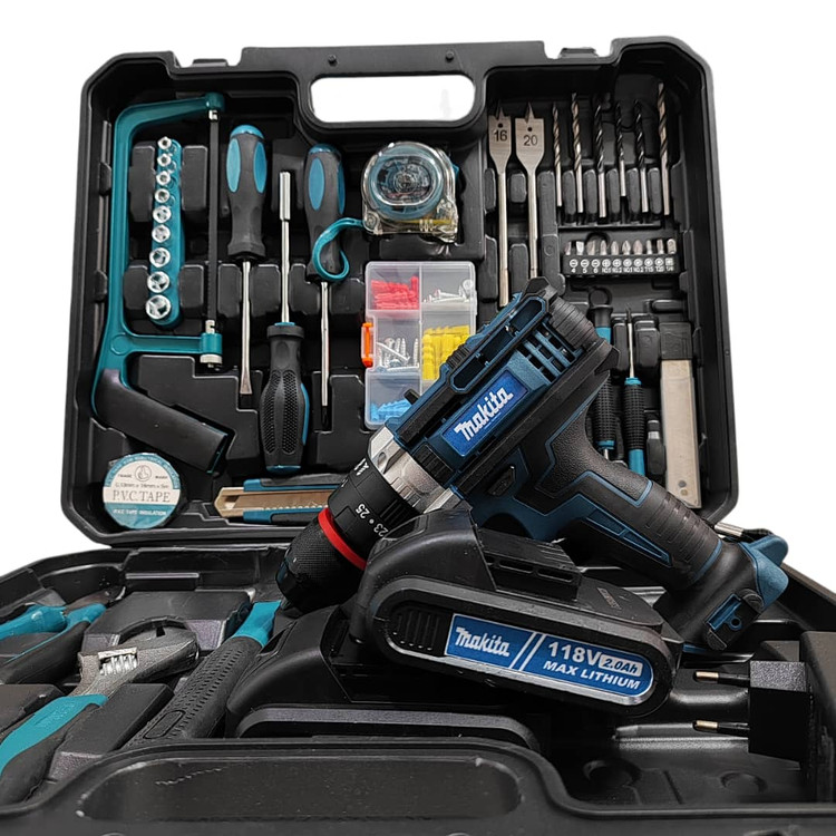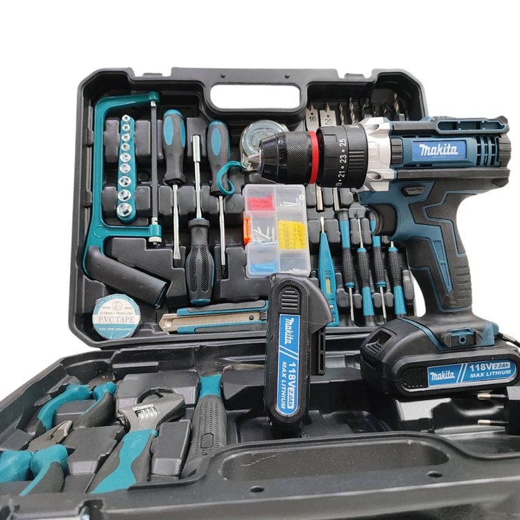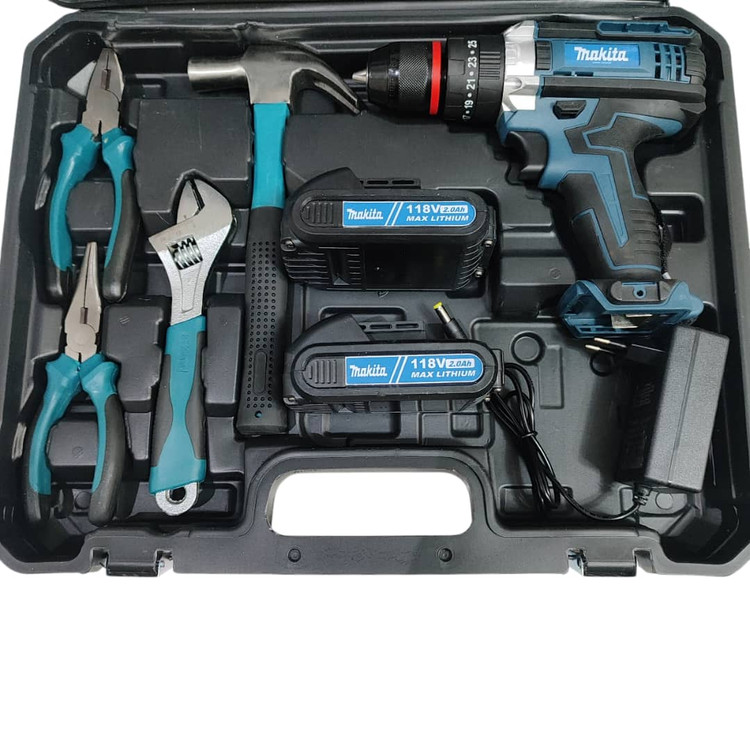 دریل شارژی چکشی ماکیتا دوباتری مدل 118 ولت سه نظام فلزی تراز دار همراه کیف و لوازم کامل پیچگوشتی شارژی ماکیتا فروش ویژه