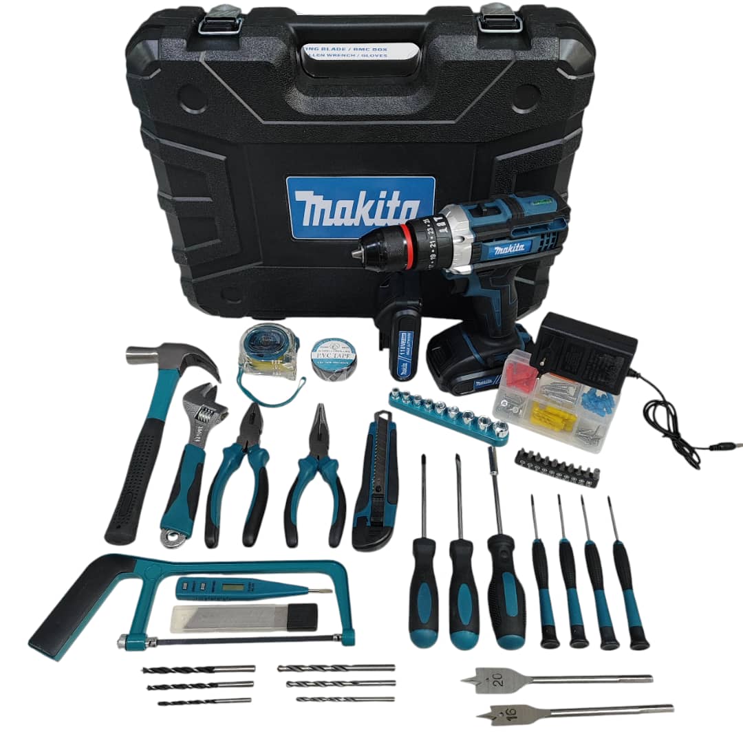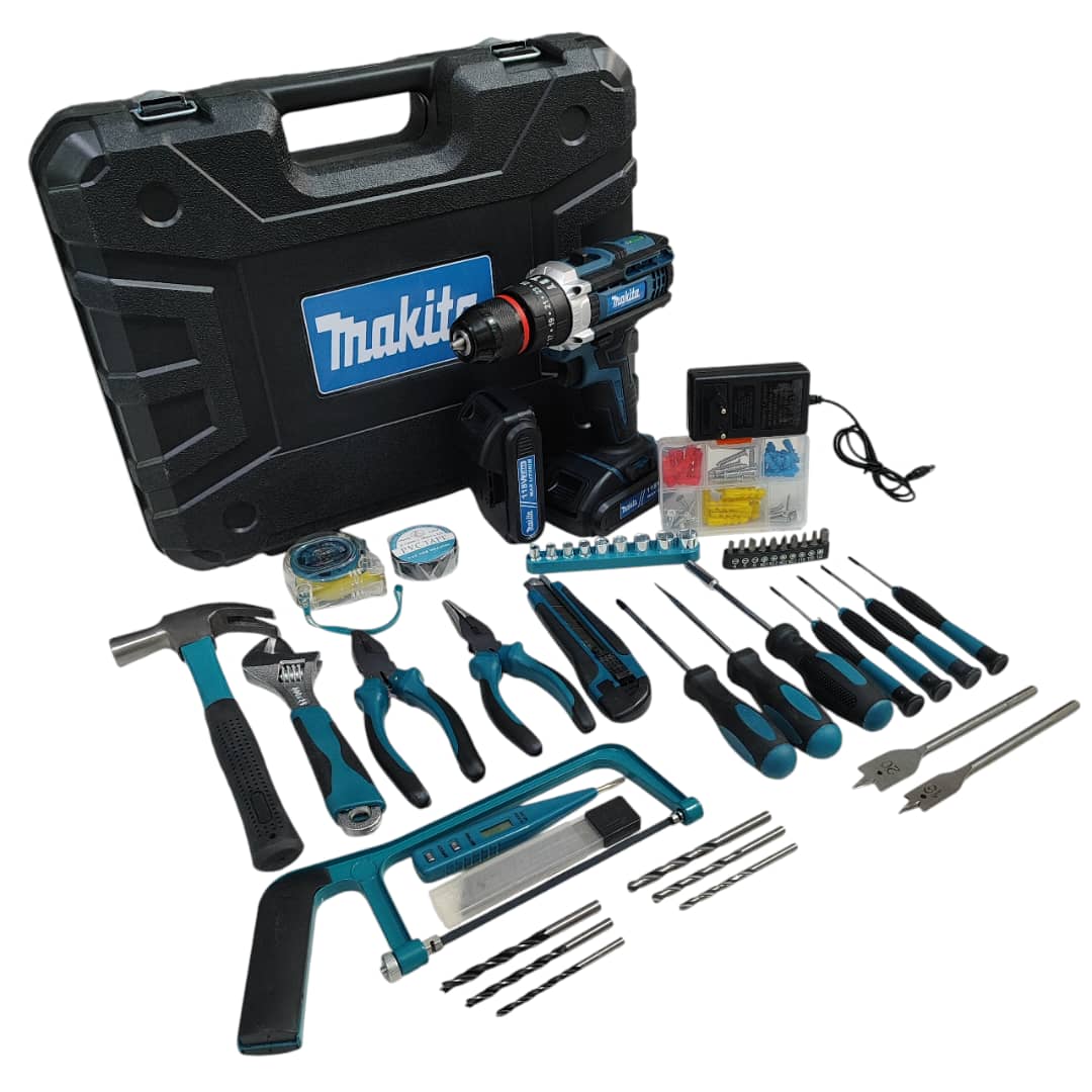 دریل شارژی چکشی ماکیتا دوباتری مدل 118 ولت سه نظام فلزی تراز دار همراه کیف و لوازم کامل پیچگوشتی شارژی ماکیتا فروش ویژه