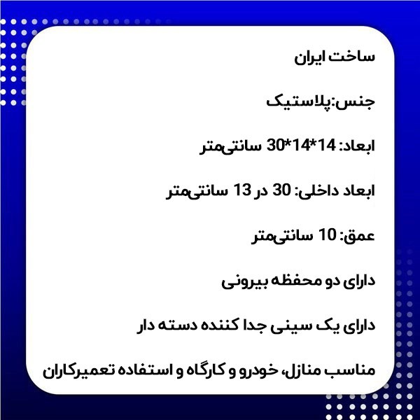 جعبه ابزار مهر مدل JMT-13 یک انتخاب عالی برای افرادی است که به دنبال یک جعبه ابزار کوچک، کاربردی و مقاوم هستند. این محصول از پلاستیک فشرده و باکیفیت ساخته شده که در برابر ضربه، فشار و شرایط مختلف محیطی مقاومت بالایی دارد. طراحی جمعوجور آن باعث میشود به راحتی در خودرو، خانه یا محل کار قابل استفاده باشد.