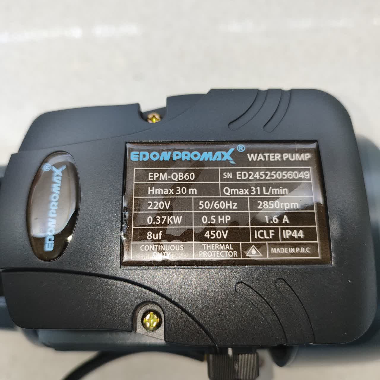 برند ادون پرومکس مدل EPM_QB60 نوع پمپ سانتریفیوژ زمینی توان 370 وات (0.5 اسب بخار) منبع تغذیه برق تکفاز 220 ولت حداکثر ارتفاع پمپاژ 30 متر حداکثر آبدهی 31 لیتر در دقیقه حداکثر فشار 5 بار سرعت چرخش 2850 دور بر دقیقه قطر ورودی 1 اینچ قطر خروجی 1 اینچ جنس پروانه برنج جنس بدنه چدن سیمپیچ تمام مس کلاس عایقبندی F درجه حفاظت IP44 حداکثر دمای آب 60 درجه سانتیگراد جریان 1.6 آمپر وزن 4 کیلوگرم ابعاد 28×14×17 سانتیمتر کاربرد افزایش فشار آب و آبیاری گارانتی اصالت و سلامت فیزیکی دستگاه