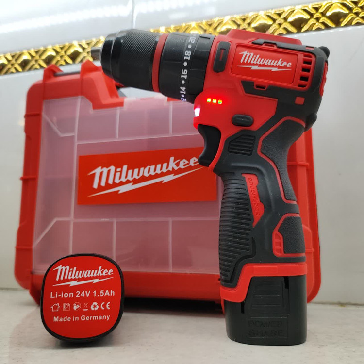دریل شارژی چکشی 24 ولت میلواکی موتور براشلس دو باطری پیچگوشتی شارژی میلواکی 24 ولت دوباتری همراه لوازم و ساک bmc دریل شارژی 24 ولت دوباتری موتوور براشلس میلواکی برند میلواکی نوع دستگاه پیچ گوشتی , دریل شارژی قابلیت تنظيم سرعت (دیمر) دارد حداکثر قطر سوراخکاری در فلز 13mm سیستم گردش راست گرد, چپ گرد مشخصات گیربکس 3 حالته منبع تغذیه باتری ( پنج سلولی ) ظرفیت باتری 24 ولت سایر امکانات دو عدد باتری رنگ بدنه مشکی - قرمز دفترچه راهنما دارد مته دارد باتری دارد شارژر دارد جعبه محکم پلاستیکی دارد سه نظام دارد