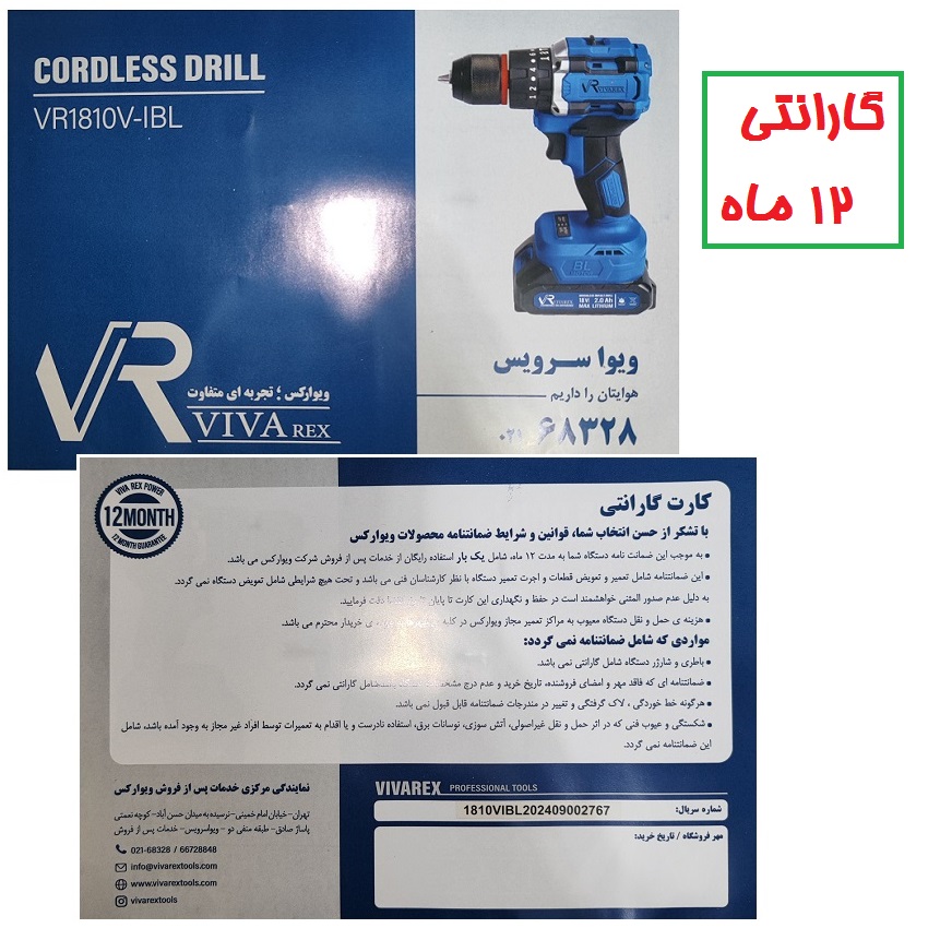دریل شارژی چکشی موتور براشلس 18 ولت دوباتری ویوارکس (VIVAREX) مدل VR1810V-1BL پیچگوشتی شارژی همراه کیف و گارانتی 12 ماهه