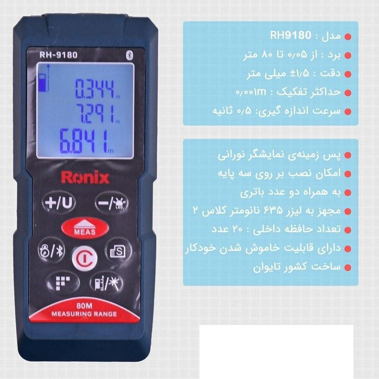 ویژگی ها - یک متر لیزری کاملاً حرفه ای و قدرتمند با امکان اندازه گیری دوربرد با دقت فوق العاده تا 3± میلی متر که مسافتی تا 80 متر (260 فوت) را اندازه گیری می کند - مجهز به بلوتوث برای اتصال به تلفن همراه با استفاده از برنامه Ronix Measurment Camera (MB) که از طریق App Store یا Google Play برای سیستم عامل های IOS و Android قابل بارگیری (دانلود) و استفاده است. - مجهز به نمایشگر رنگی با نور پس زمینه جهت خوانش آسان، که اعداد را در مناطق تاریک با وضوح بالا و به صورت مجزا روشن می کند و اجازه می دهد در محیط های تاریک یا با نور کم کار کنید - با قابلیت خاموش شدن اتوماتیک بعد از 180 ثانیه برای حفظ انرژی باتری - ضد آب و ضد گرد و غبار با استاندارد بین المللی IP54 که از دستگاه محافظت کرده و امکان کار در شرایط سخت مانند کار در محیط های بارانی یا پر از گرد و غبار را فراهم می کند - دارای قابلیت انجام عملکرد های کاربردی اندازه گیری شامل: اندازه گیری طول، مساحت، حجم، فیثاغورث، جمع و تفریق، اندازه گیری حداقل و حداکثر، تایمر با شمارش معکوس و اندازه گیری مستمر که این متر لیزری را به ابزاری ایده آل برای استفاده در خانه، ساخت و ساز و صنایع مختلف تبدیل می کند - دارای طراحی خوش دست و جمع و جور که احساس خوبی به کاربر ارائه می دهد و بدنه ای پوشیده از رابر ضدلغزش که امکان راحت در دست گرفتن دستگاه را فراهم می کند. - دارای حافظه ذخیره سازی داده ها که می تواند برای مشاهده و مقایسه اندازه گیری های قبلی با اندازه گیری جدید مورد استفاده قرار گیرد - دارای قابلیت اندازه گیری بر اساس متر و اینچ و همچنین تبدیل این واحدهای اندازه گیری به یکدیگر - دارای عملکرد Stake out که فاصله واقعی و مشخص شده را با رنگ های مختلف نشان می دهد - با قابلیت نمایش چند خط مشخصات کد محصول RH-9180 بُرد دستگاه 0.2 تا 80 متر دقت 1.5± میلیمتر (±0.06 اینچ) نوع لیزر کلاس 2 درجه محافظت از لیزر ضد آب، ضد گردوغبار و دارای استاندارد IP54 زمان خاموشی خودکار لیزر بعد از 30 ثانیه زمان خاموشی خودکار دستگاه بعد از 180 ثانیه منبع تغذیه دو عدد باتری 1.5 ولت AAA واحد های اندازهگیری متر/اینچ/فوت/فوت+اینچ دمای نگهداری 20- الی 60 درجه سانتیگراد دمای کارکرد 5- الی 40 درجه سانتیگراد طول عمر باتری 10,000 بار محدوده زاویه اندازهگیری 180- تا 180+ قابلیت های عملکردی "مسافت / مساحت / حجم / فیثاغورث / اندازه گیری مستمر / جمع و تفریق / اندازهگیری حداقل و حداکثر / تایمر با شمارش معکوس " اتصال بلوتوث دارد عملکردها مسافت / مساحت / حجم / فیثاغورث / اندازه گیری مستمر / جمع و تفریق / اندازه گیری حداقل و حداکثر / تایمر با شمارش معکوس متعلقات سه عدد باتری 1.5 ولت AAA و یک کیف حمل پارچهای متعلقات سه عدد باتری 1.5 ولت AAA و یک کیف حمل پارچه ای