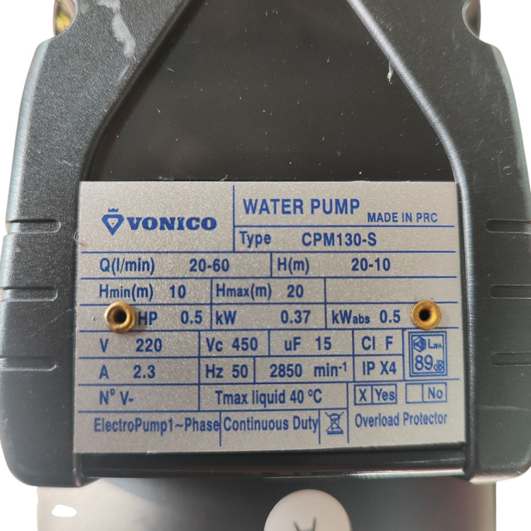 حداکثر ارتفاع: 20 متر حداکثر دبی: 90 لیتر در دقیقه توان: 0.5 اسب بخار برق مصرفی: تکفاز جنس بدنه: چدنی جنس پروانه: کشور سازنده: چین الکترو پمپ نیم اسب بشقابی بدون صدا سیم پیچی تمام مسی شفت استیل توان 0.5 اسب / 0.37 کیلووات حداکثر ارتفاع آبدهی :20 متر تغذیه برق 220 ولت تکفاز فرکانس کاری دستگاه : 50 هرتز جنس بدنه : چدن دارای شفت استنلس استیل حداکثر دمای محیط : 40 درجه سانتی گراد حداکثر دمای سیال : 60 درجه سانتی گراد مقاومت در برابر آب و گرد و خاک : IP54 دارای قابلیت خاموش شدن پمپ در صورت اضافه جریان (Thermal Overload Protector)