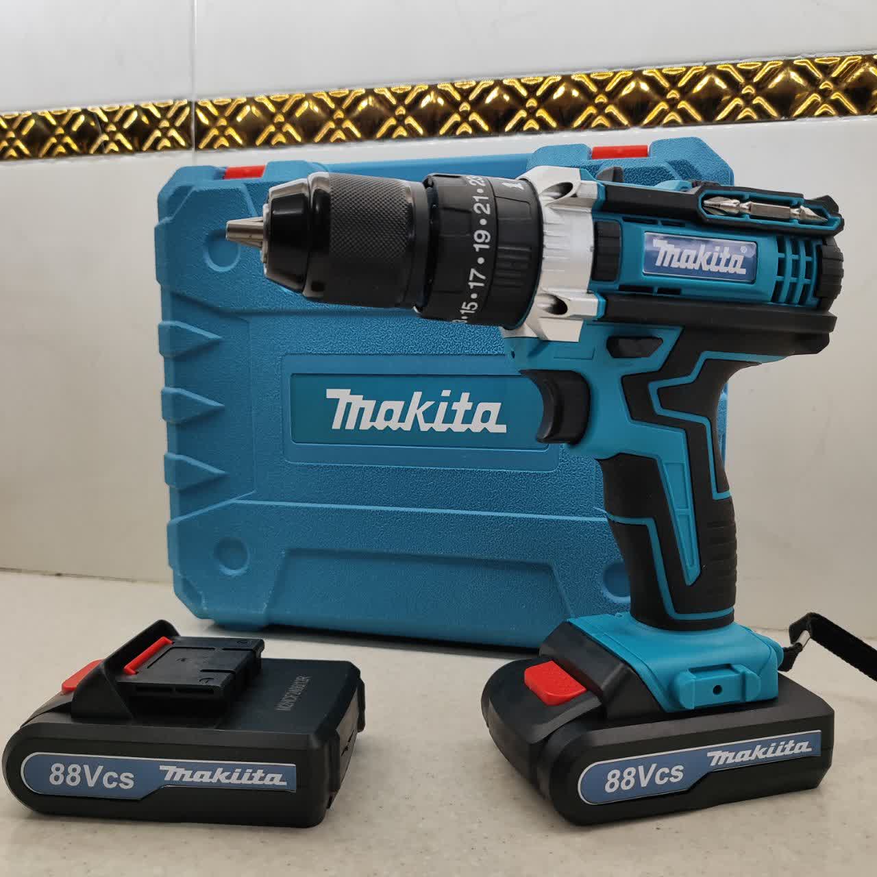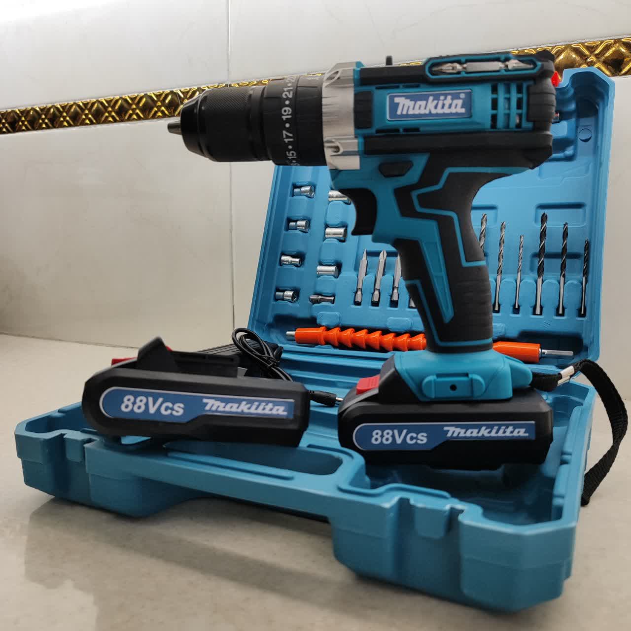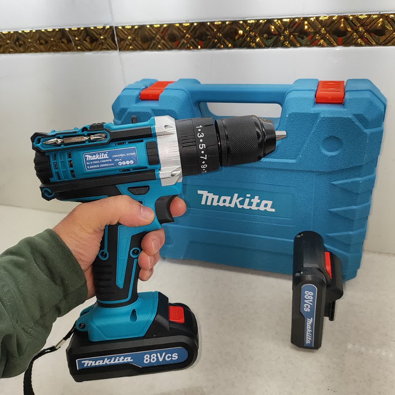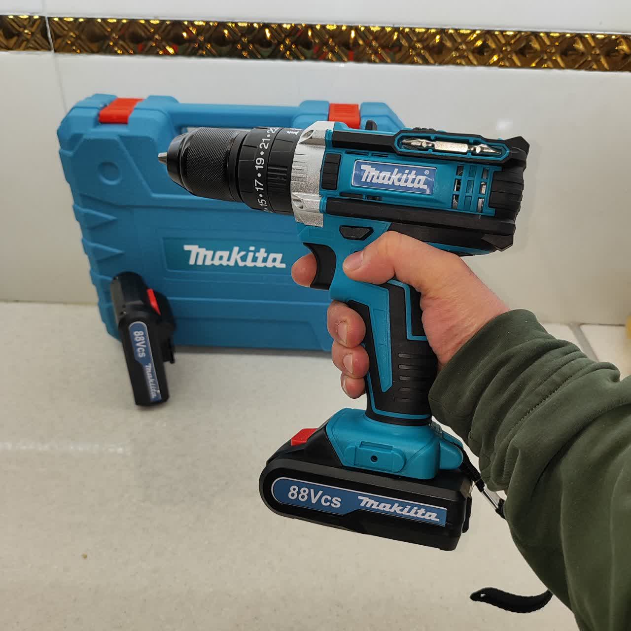 دریل شارژی چکشی 88 ولت ماکیتا دوباتری سه نظام فلزی دارای تراز پیچگوشتی شارژی 88 ولت ماکیتا با کیف و لوازم جانبی کامل
