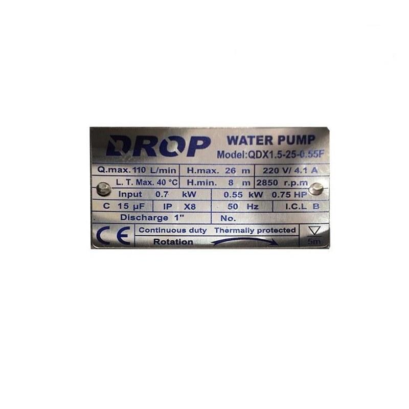 کشور سازنده چین شرکت سازنده دراپ DROP سری کفکش نوع سیال آب حداقل دمای سیال 0 درجه سانتیگراد حداکثر دمای سیال 40 درجه سانتیگراد حداکـثر آبدهی 110 لیتر در دقیقه حداقل ارتفاع پمپاژ 8 متر حداکثر ارتفاع پمپاژ 26 متر دهانه خروجی 1 اینچ جنس بدنه آلومینیوم جنس پروانه آلومینیوم تعداد پروانه 1 عدد توان 0.75 اسب (0.55 کیلووات) تعداد فاز تک فاز کلاس عایق B کلاس حفاظت X8 خازن 15 میکروفاراد ولتاژ نامی 220 ولت جریان 4.1 آمپر دارای فلوتر حداکثر سرعت چرخش 2850 دور در دقیقه سیم لاکی استفاده شده تمام مس