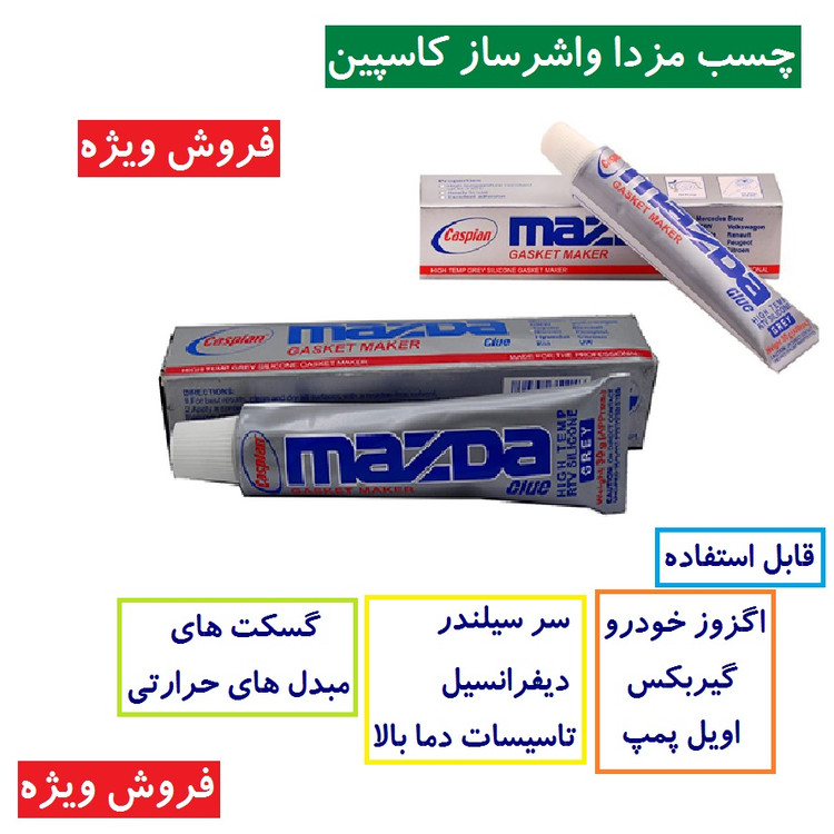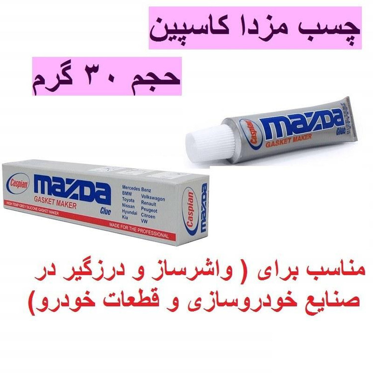 نوع کاربرد فلز پلاستیک شیشه درزگیر سایر توضیحات محصولی خمیری، تک جزئی، طوسی رنگ، رطوبت خشک و بر پایه سیلیکون های استوکسی کاربرد: به عنوان واشرساز و درزگیر در صنایع خودروسازی و قطعات خودرو چسب مزدا یک محصول تک جزئی بر پایه شیمیایی استوکسی می باشد.سیلیکون حرارتی واشر ساز با مقاومت حرارتی 330 درجه سانتی گراد مصارف متعددی دارد، از جمله در صنعت اتومبیل سازی به منظور آب بندی دیفرانسیل، درب سوپاپ، واتر پمپ و سر سیلندر قابل استفاده می باشد. این چسب به رنگ طوسی تولیده شده و در مقابل مواد شیمیایی و پتروشیمی و روغن های داغ مقاوم است.