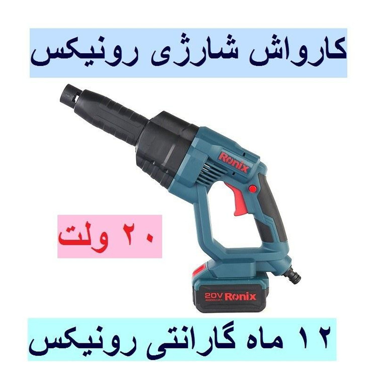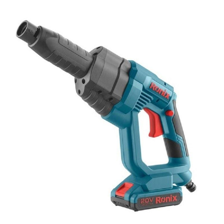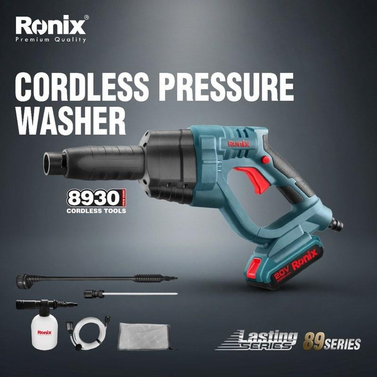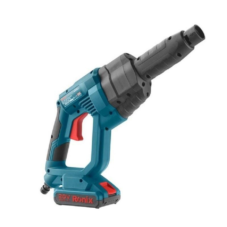 حالت کارکرد 6(0°,15°,25°,40°,شست و شو,مورب کد محصول 8930 ولتاژ باتری 20ولت ظرفیت باتری 20 آمپر ساعت حداکثر جریان آب خروجی 2لیتر بر دقیقه فشار کاری 24.5بار حداکثر قدرت مکش 4متر میزان پاشش 15ثانیه مدت زمان شارژ شدن 1ساعت متعلقات 6مترشلنگ،کیسه غبار،سری اتصال بطری،مخزن کف پاش،لانس، نوع بستهبندی جعبه رنگی رونیکس طراحی سبک و قابل حمل برای استفاده در مناطق بدون دسترسی به برق و اب لوله کشی دارای قابلیت خود مکشی به منظور مکش از مخزن آب برای تمیز کاری و آبیاری در منازل و باغ نازل با قابلیت پاشش در 6 حالت مختلف و کاربردی قابلیت نصب مخزن کف پاش امکان تمیزکاری با فشار زیاد و همچنین فشار ملایم دارای شلنگ 6 متری فیلتر دار دسته ارگونومیک با روکش لاستیکی نرم و قابلیت ضد لغزندگی