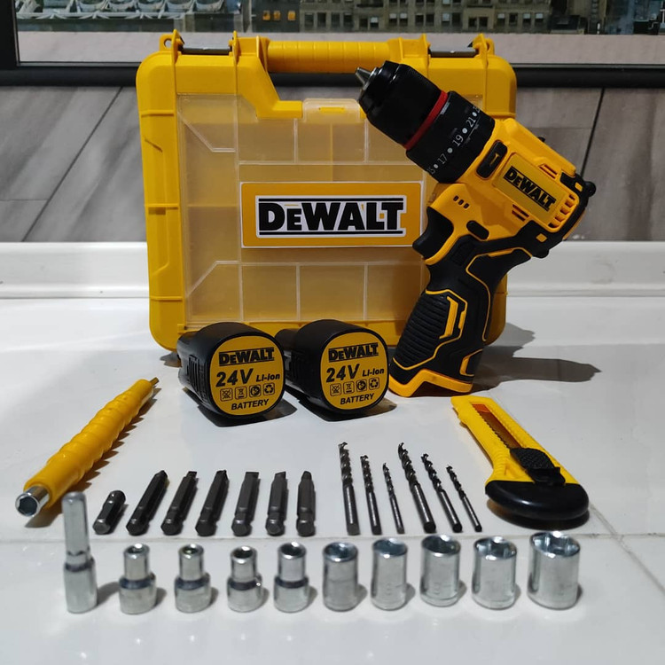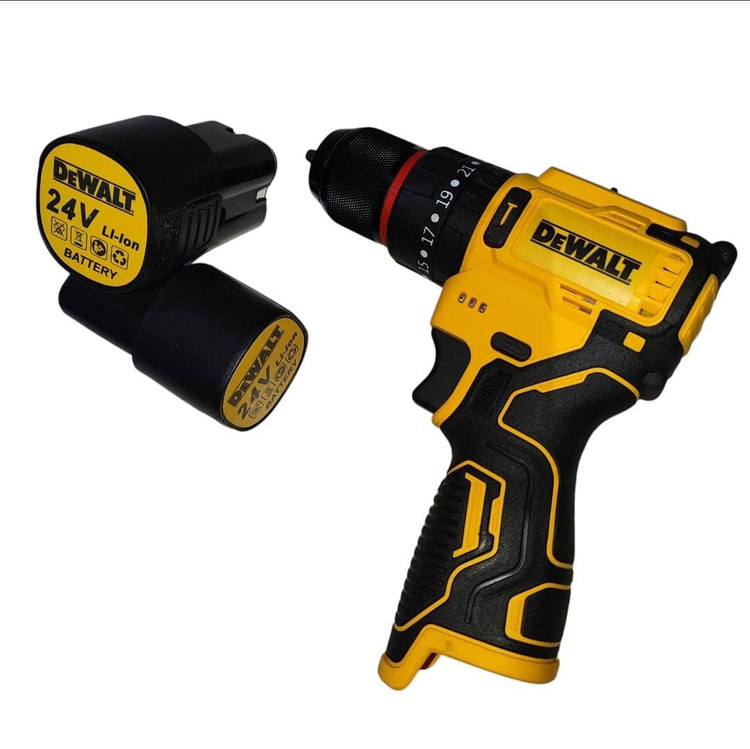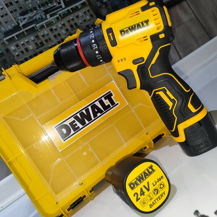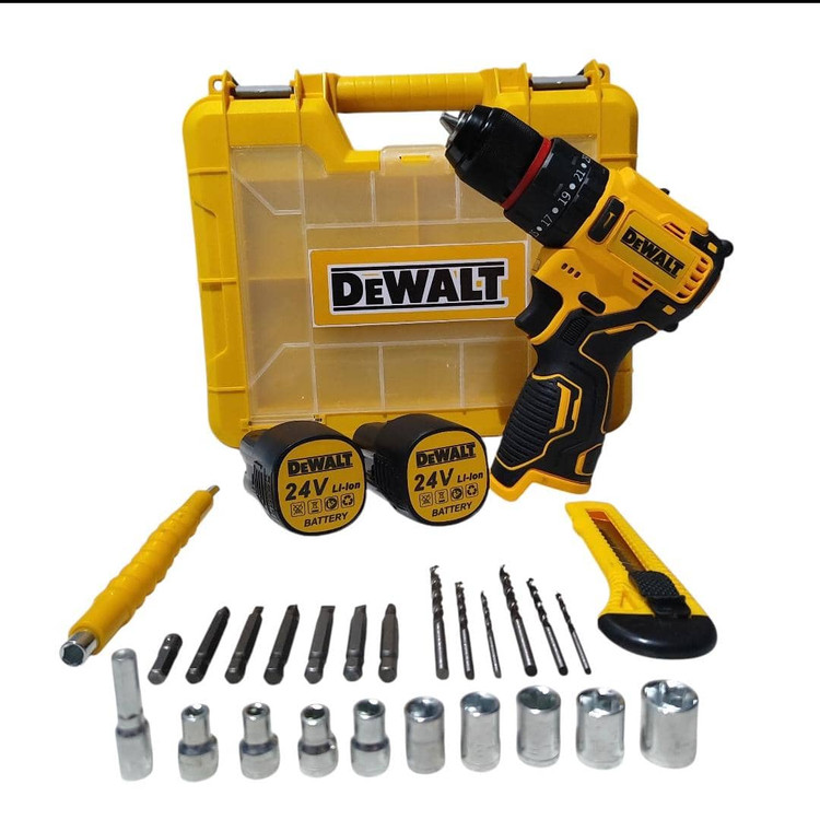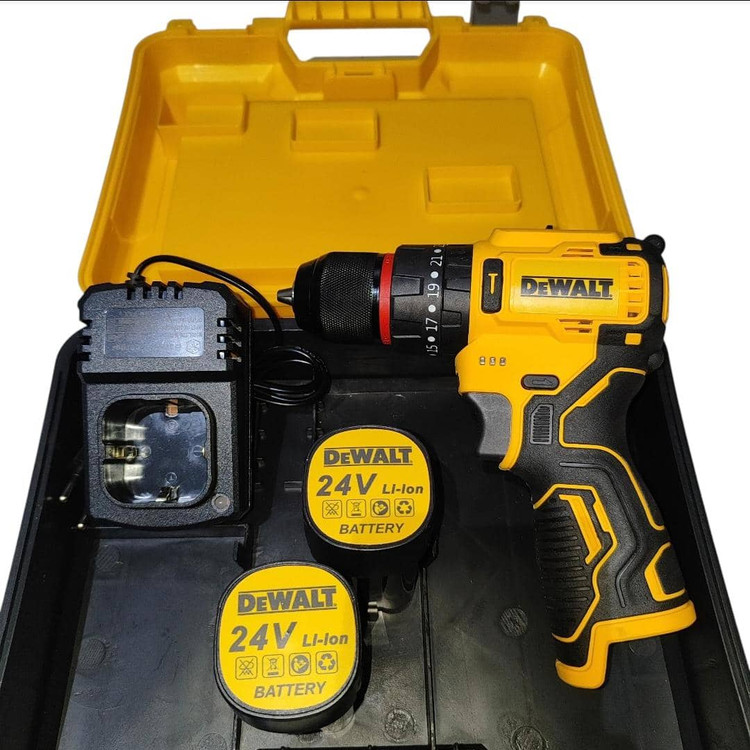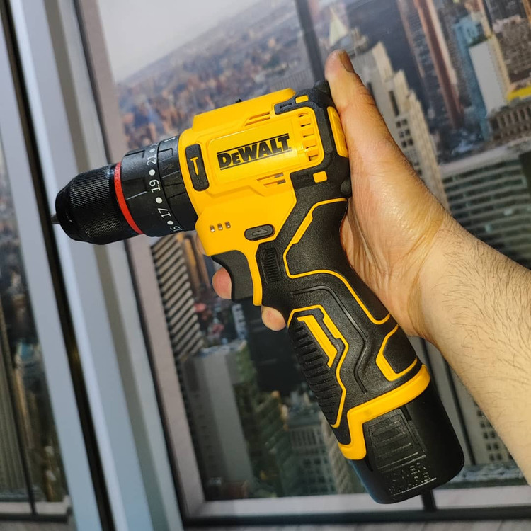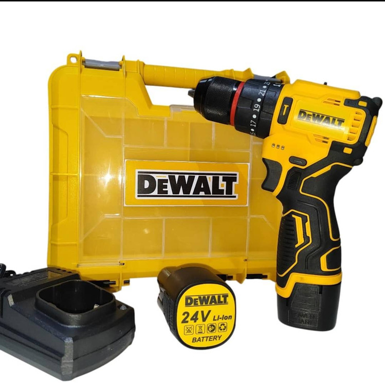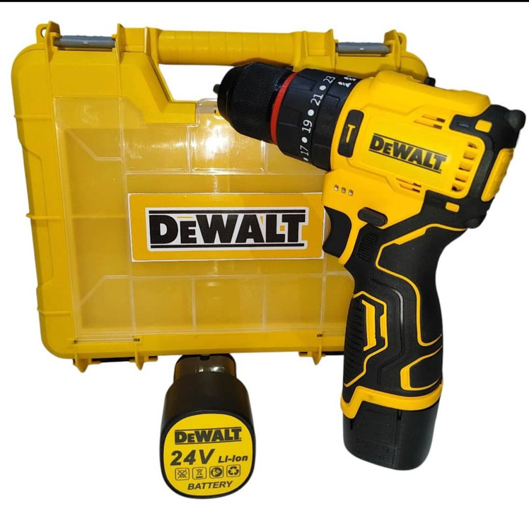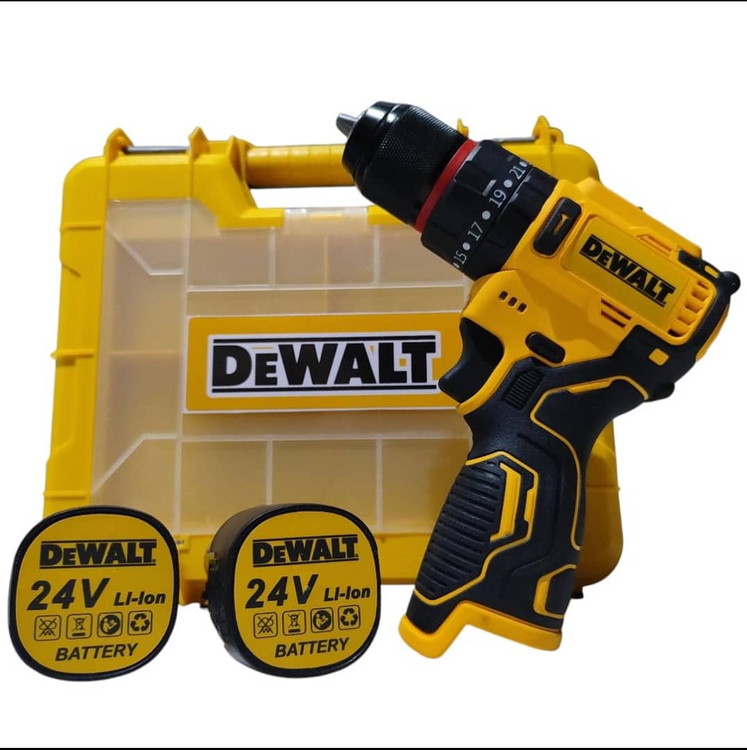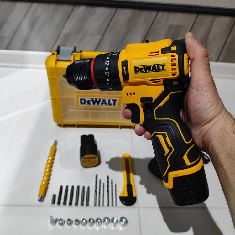 دریل شارژی چکشی 24 ولت دیوالت دوباتری سه نظام فلزی پیچگوشتی شارژی 24 ولت دیوالت با کیف و لوازم جانبی کامل دارای دو عدد باطری د️ریل سه حالته (چکشی،دریل،پیچ بند) ️سه نظام اتومات فلزی دارای دیمر کنترل سرعت ️گیربکس دوحالته (سرعتی،قدرتی) م️دل24 ولت چپ گرد و راست گرد س️اخت چین ️طراحی ارگونومیک برای سهولت در کار ️همراه لوازم کاربردی مطابق تصویر ️دارای جعبه حمل سبک وزیبا ویژگیهای دریل سیستم گردش چپگرد سیستم گردش راستگرد قابلیت کنترل سرعت قفل سوییچ منبع تغذیه باتری مشخصات سهنظام اتوماتیک فلزی توضیحات باتری دارای دوعدد باتری 24 ولت پرقدرت سایر توضیحات امکان تنظیم در سه حالت چکشی ، ساده و پیچ گوشتی دارای کلاچ همراه لوازم جانبی کامل و ساک bmc