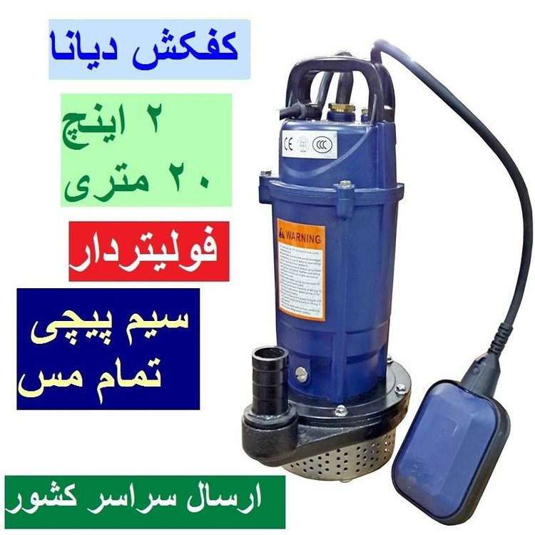 کفکش 2 اینچ سیم پیچی تمام مس ماکزیمم ارتفاع 20 متر خروجی2اینچ ولتاژ تک فاز (220 ولت) – کف کش های دیانا با توجه به نیاز مشتری در ظرفیت های متفاوتی تولید و به بازار عرضه می شوند. – ولتاژ تمامی کف کش های دیانا به صورت تک فاز 220 ولت می باشند. – حداکثر آبدهی کفش کش 2 اینچ دیانا با ارتفاع 20 متر 20 متر مکعب در ساعت می باشد. – از کف کش های دیانا در چاه، مزارع، باغات، استخرها، آب نما، فواره، انتقال آب باران، مصارف کشاورزی و صنعتی استفاده می شوند. – قدرت الکتروموتور کفکش 2 اینچ با ارتفاع 20 متر دیانا، 0/75 اسب بخار می باشد. – این کف کش ها هم به همراه فلوتر و هم بدون فلوتر ارائه می شوند. – در این پمپ های کفکش از سیستم خنک کننده استفاده شده است. – کفکش های دیانا پمپ به همراه 10 سال خدمات پس از فروش توسط شرکت ارائه می شوند.